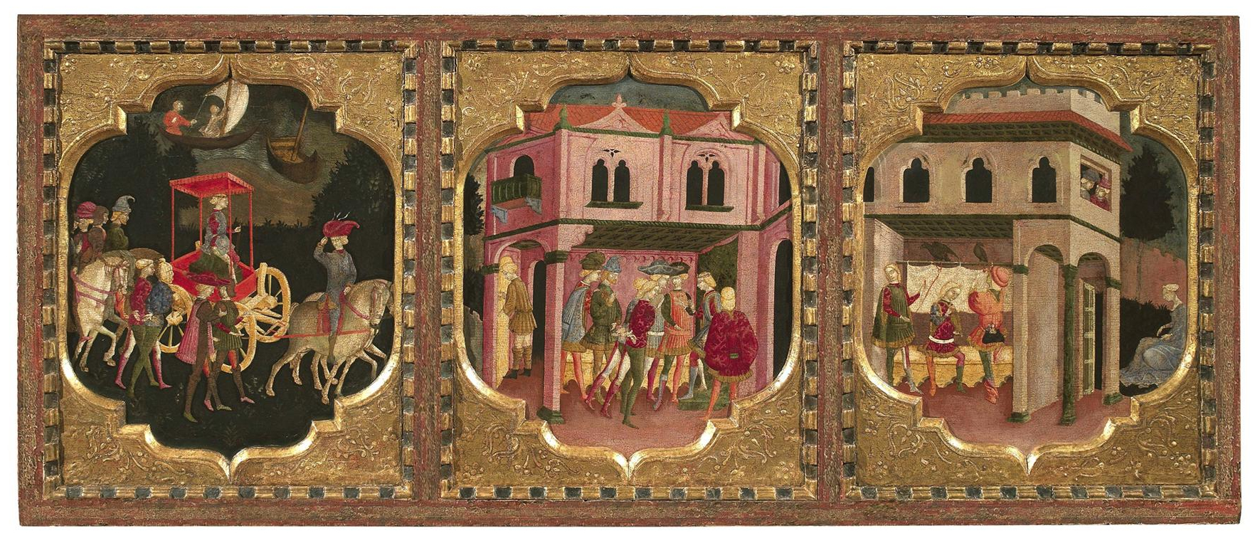 Paolo di Giovanni da Visso (1440 c.), Trionfo di Teseo; Teseo fa imprigionare Arcita e Palemone; Arcita e Palemone si innamorano di Emilia