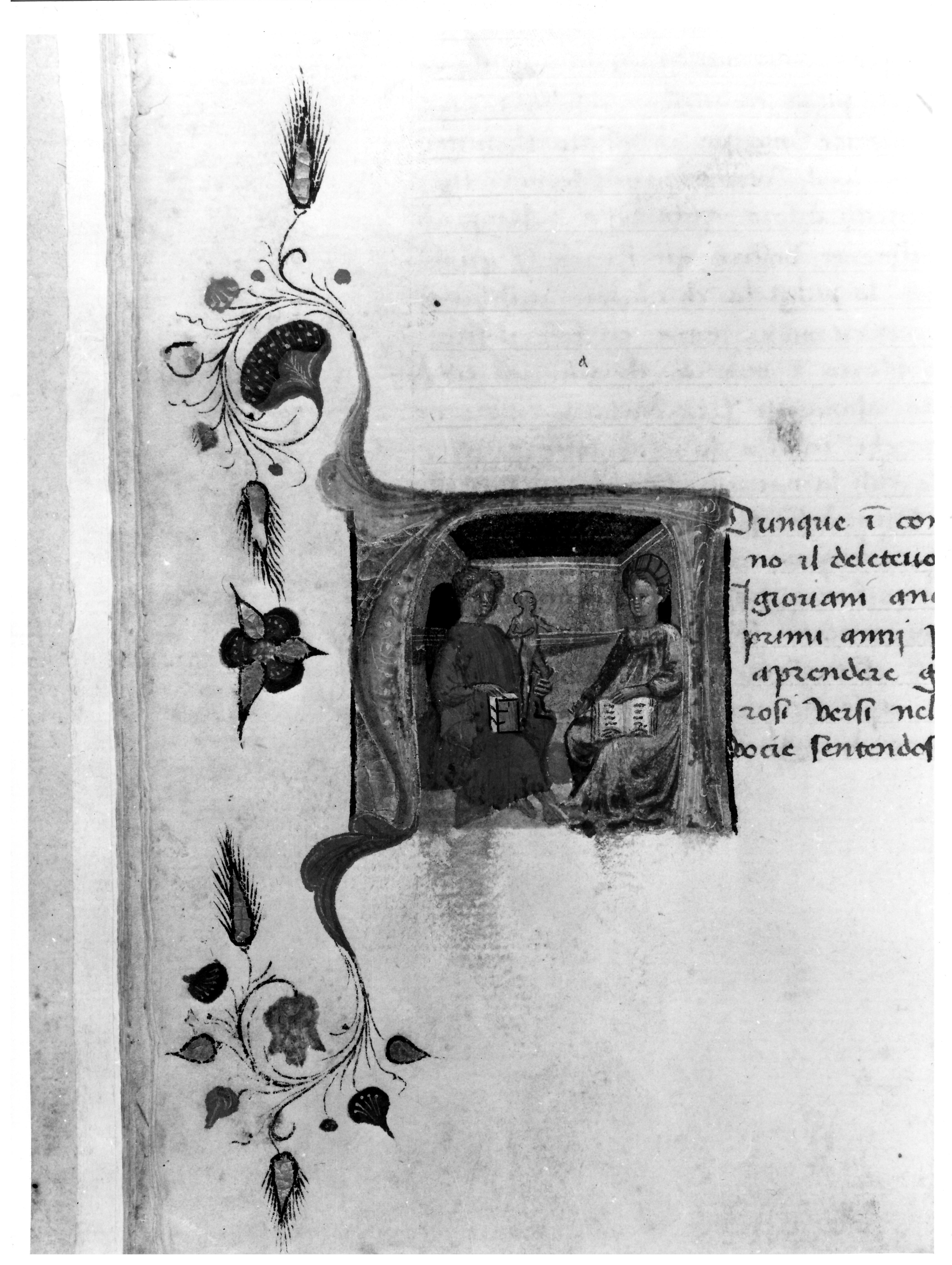 Venezia, Biblioteca Nazionale Marciana, It. X. 31, f. 15v. Il manoscritto è datato 3 febbraio 1429 [1430]. Florio, che regge un amorino senza ali, e Biancifiore siedono in un interno con i libri in grembo, all'interno dell'iniziale istoriata A(dunque).