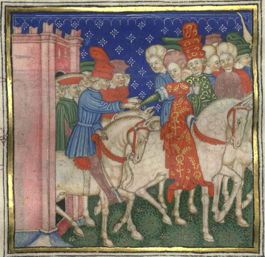 Kassel, Universitätsbibliothek Kassel, Landesbibliothek und Murhardsche Bibliothek der Stadt Kassel, 2° poet. et roman. 3, f. 5v. Lelio e Giulia lasciano Roma per recarsi in pellegrinaggio a Compostella con una scorta a cavallo.