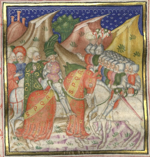 Miniatore lombardo (1450 c.), Giulia cerca di trattenere Lelio