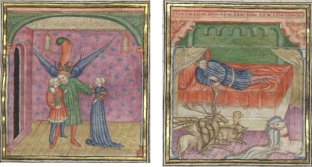 Miniatore lombardo (1450 c.), Cupido abbraccia i giovani Florio e Biancifiore; il re ha un sogno in cui compaiono diversi animali