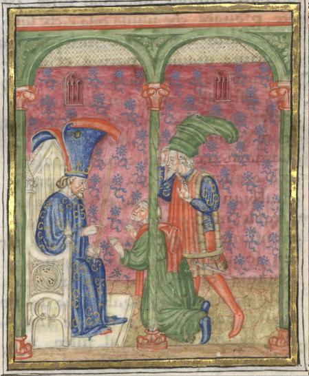 Kassel, Universitätsbibliothek Kassel, Landesbibliothek und Murhardsche Bibliothek der Stadt Kassel, 2° poet. et roman. 3, f. 24r. I maestri Racheio e Ascalion raccontano al re dell'amore nato tra Florio e Biancifiore.