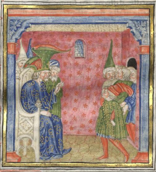 Kassel, Universitätsbibliothek Kassel, Landesbibliothek und Murhardsche Bibliothek der Stadt Kassel, 2° poet. et roman. 3, f. 26r. Il re convoca Florio nella sala del trono per informarlo della sua intenzione di mandarlo dal duca Feramonte.