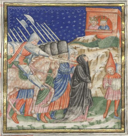 Kassel, Universitätsbibliothek Kassel, Landesbibliothek und Murhardsche Bibliothek der Stadt Kassel, 2° poet. et roman. 3, f. 52r. Biancifiore, spinta in avanti dl siniscalco, si volge a rimproverare il re e la regina affacciati ad una finestra.