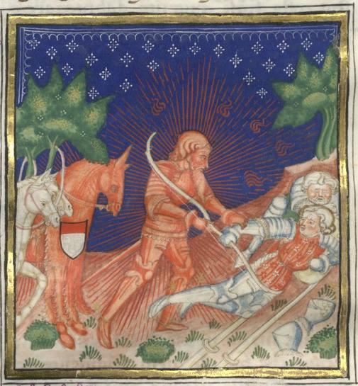 Kassel, Universitätsbibliothek Kassel, Landesbibliothek und Murhardsche Bibliothek der Stadt Kassel, 2° poet. et roman. 3, f. 53v. Il dio Marte sveglia Florio dal suo sonno afferrandolo per un braccio.