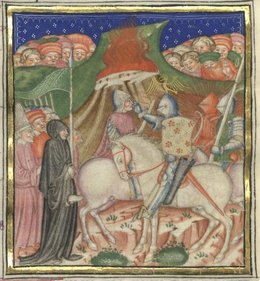 Kassel, Universitätsbibliothek Kassel, Landesbibliothek und Murhardsche Bibliothek der Stadt Kassel, 2° poet. et roman. 3, f. 54v. Florio, giunto sul luogo dove è stato preparato il rogo, impedisce al siniscalco di giustiziare Biancifiore.