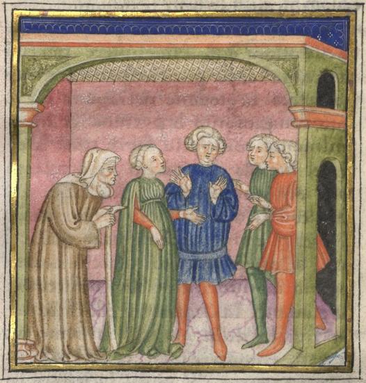 Kassel, Universitätsbibliothek Kassel, Landesbibliothek und Murhardsche Bibliothek der Stadt Kassel, 2° poet. et roman. 3, f. 131r. È raffigurata la dodicesima questione d'amore: un giovane viene sorpreso in compagnia di una fanciulla e di una vecchia.