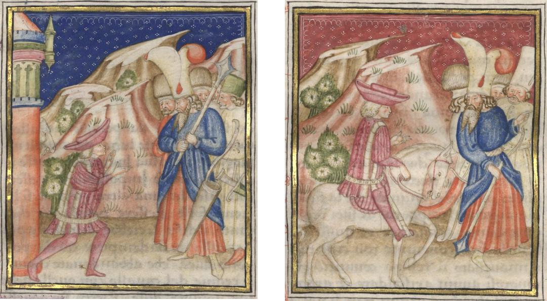 Kassel, Universitätsbibliothek Kassel, Landesbibliothek und Murhardsche Bibliothek der Stadt Kassel, 2° poet. et roman. 3, f. 143v. La carta presenta due miniature: Filocolo giustifica le sue azioni dinanzi all'arabo Sadoc e ai suoi sergenti; Filocolo segue Sadoc ed i suoi uomini a cavallo.