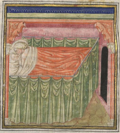 Kassel, Universitätsbibliothek Kassel, Landesbibliothek und Murhardsche Bibliothek der Stadt Kassel, 2° poet. et roman. 3, f. 151v. Filocolo giace accanto a Biancifiore addormentata.