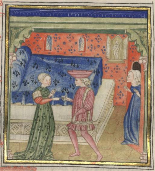 Kassel, Universitätsbibliothek Kassel, Landesbibliothek und Murhardsche Bibliothek der Stadt Kassel, 2° poet. et roman. 3, f. 152v. Filocolo sposa Biancifiore porgendole l'anello nuziale dinanzi alla statua di Cupido posta in un tabernacolo.