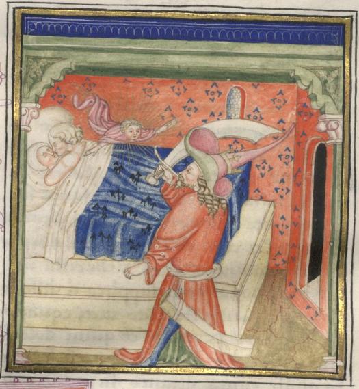 Kassel, Universitätsbibliothek Kassel, Landesbibliothek und Murhardsche Bibliothek der Stadt Kassel, 2° poet. et roman. 3, f. 153v. Venere impedisce all'ammiraglio di uccidere Filocolo e Biancifiore, i quali giacciono nel letto abbracciati.