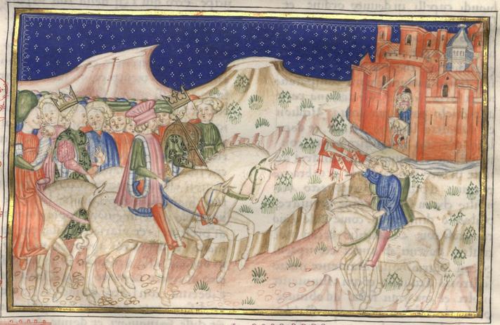Kassel, Universitätsbibliothek Kassel, Landesbibliothek und Murhardsche Bibliothek der Stadt Kassel, 2° poet. et roman. 3, f. 198r. Filocolo e Biancifiore giungono in vesti regali accompagnati da un corteo a cavallo alle porte di Roma, dove sono accolti da alcuni trombettieri e dai parenti della fanciulla.