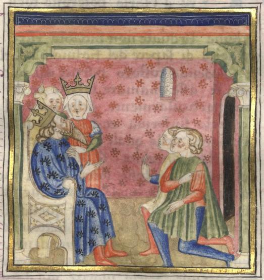Kassel, Universitätsbibliothek Kassel, Landesbibliothek und Murhardsche Bibliothek der Stadt Kassel, 2° poet. et roman. 3, f. 202r. Il re e la regina ricevono gli ambasciatori inviati da Florio, i quali annunciano il ritorno del giovane e la sua conversione alla fede cristiana.