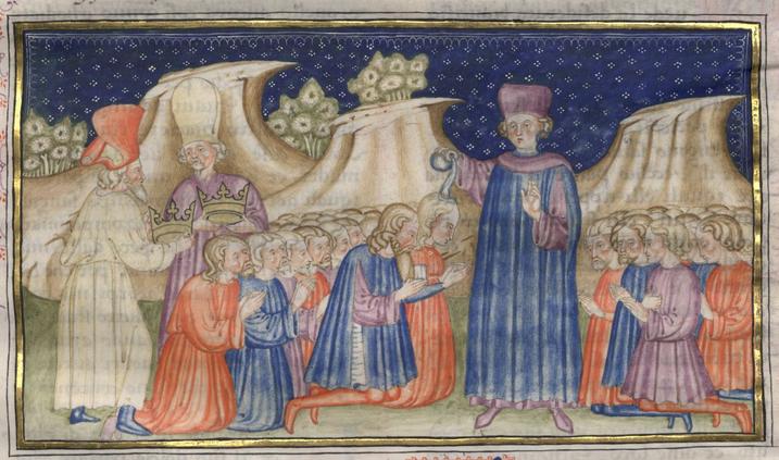 Kassel, Universitätsbibliothek Kassel, Landesbibliothek und Murhardsche Bibliothek der Stadt Kassel, 2° poet. et roman. 3, f. 204r. Ilario battezza il re, la regina e tutto il popolo di Marmorina.