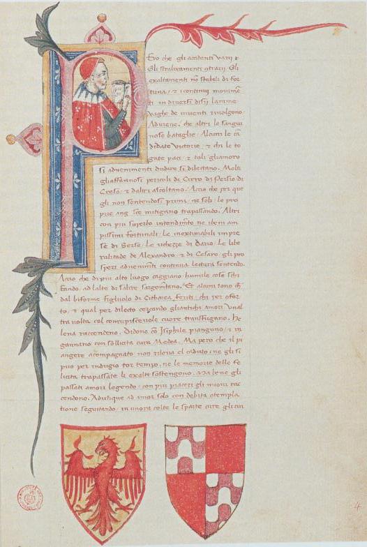 Firenze, Biblioteca Medicea Laurenziana, Ashburnham 1346, f. 2r. Il copista del manoscritto, datato 15 marzo 1400, è Lorenzo da San Gimignano. Ritratto a mezzobusto di profilo dell'autore Giovanni Boccaccio, il quale indica la pagina di un libro aperto, all'interno dell'iniziale figurata P(erò).