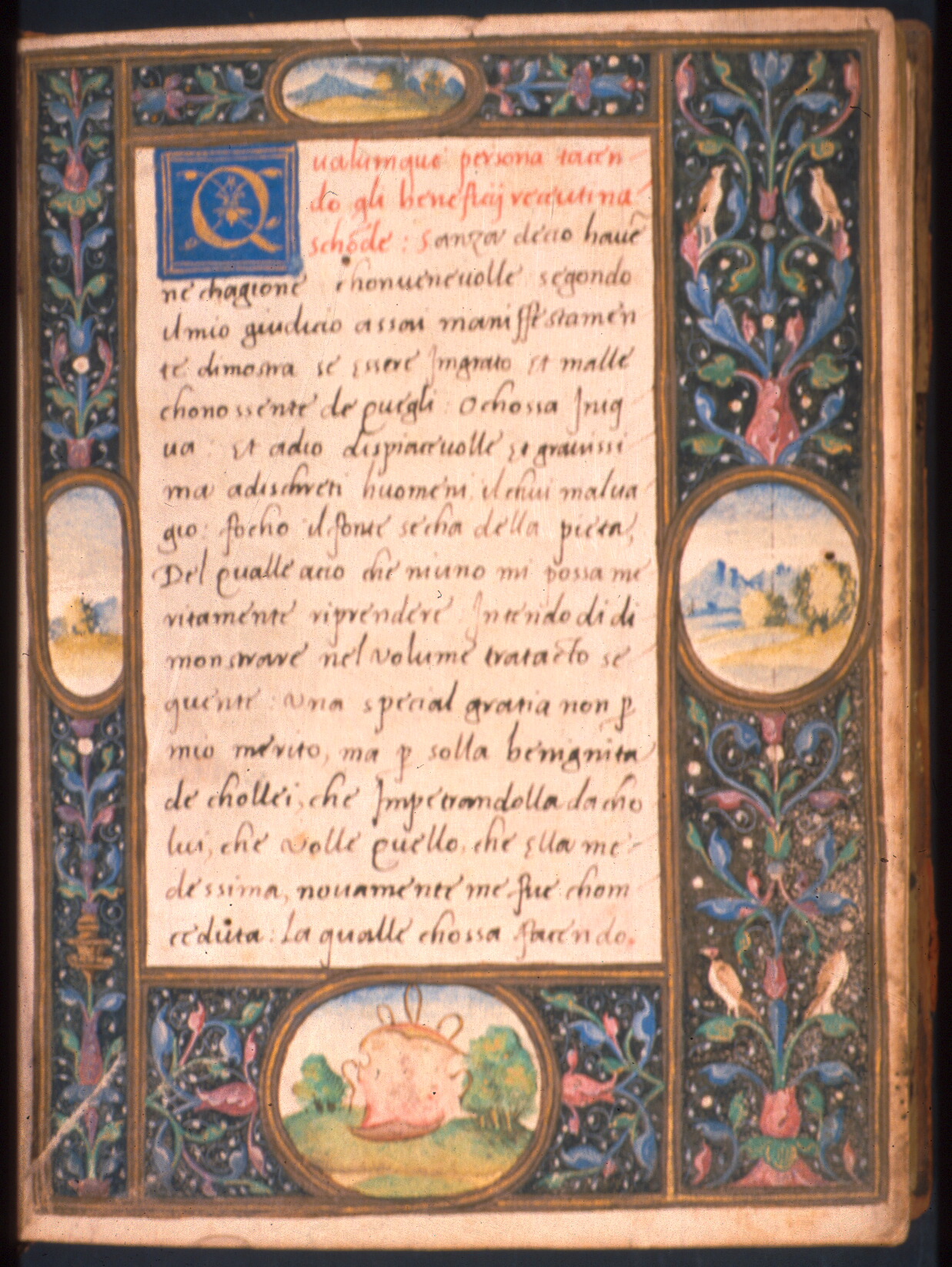 Glasgow, University of Glasgow, Library of the Hunterian Museum, Hunter 29 (S.2.19), f. 1r. Nella cornice a margine quattro vignette illustrano quattro paesaggi campestri; nella vignetta inferiore è presenta uno stemma abraso.