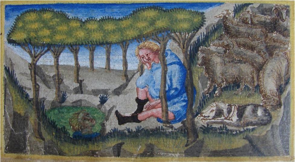 Venezia, Biblioteca Nazionale Marciana, It. IX. 63, f. 19v. Africo, seduto in un boschetto accanto al cane ed il gregge, contempla malinconicamente il proprio volto riflesso nell'acqua.