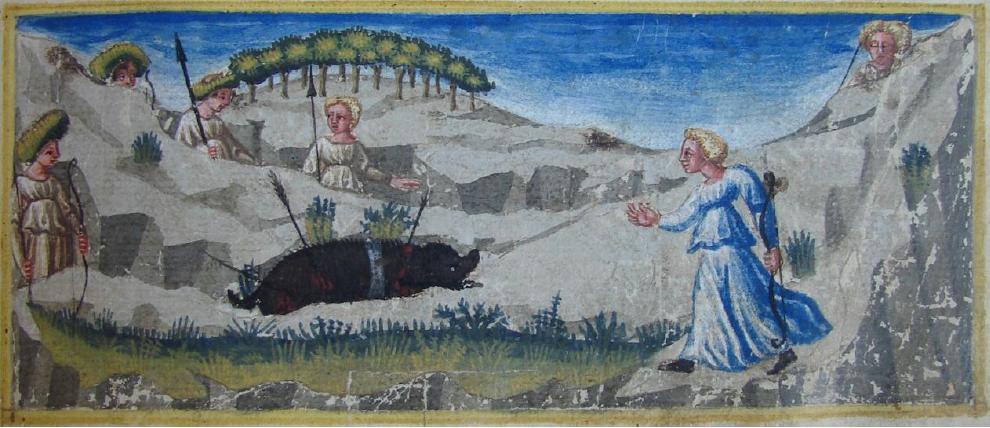 Miniatore fiorentino (1450 c.), Africo uccide un cinghiale durante la caccia