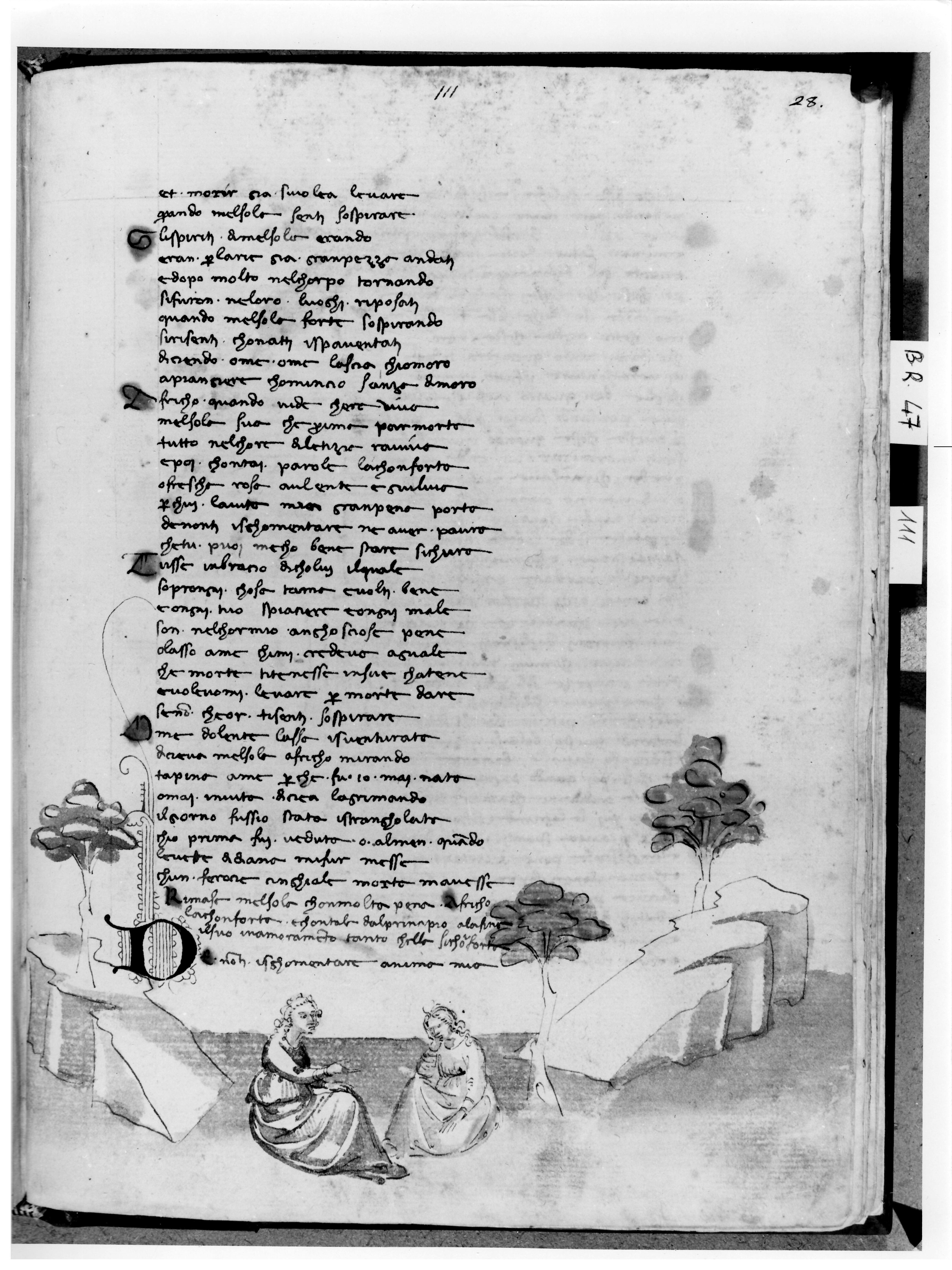 Firenze, Biblioteca Nazionale Centrale, B. R. 47, f. 111r. Africo siede accanto a Mensola e tenta di confortarla.