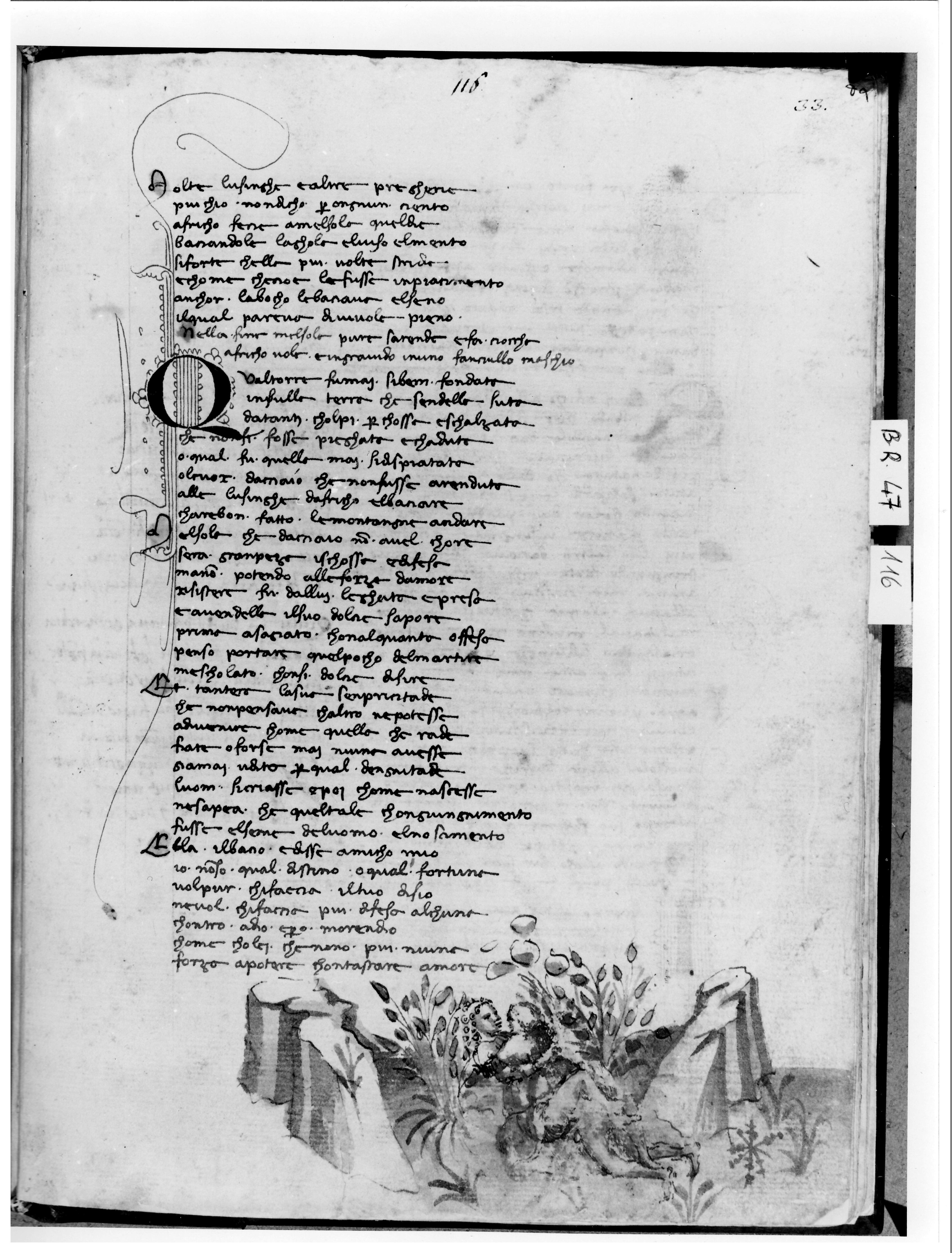 Firenze, Biblioteca Nazionale Centrale, B. R. 47, f. 116r. Africo giace con Mensola disteso tra i cespugli.