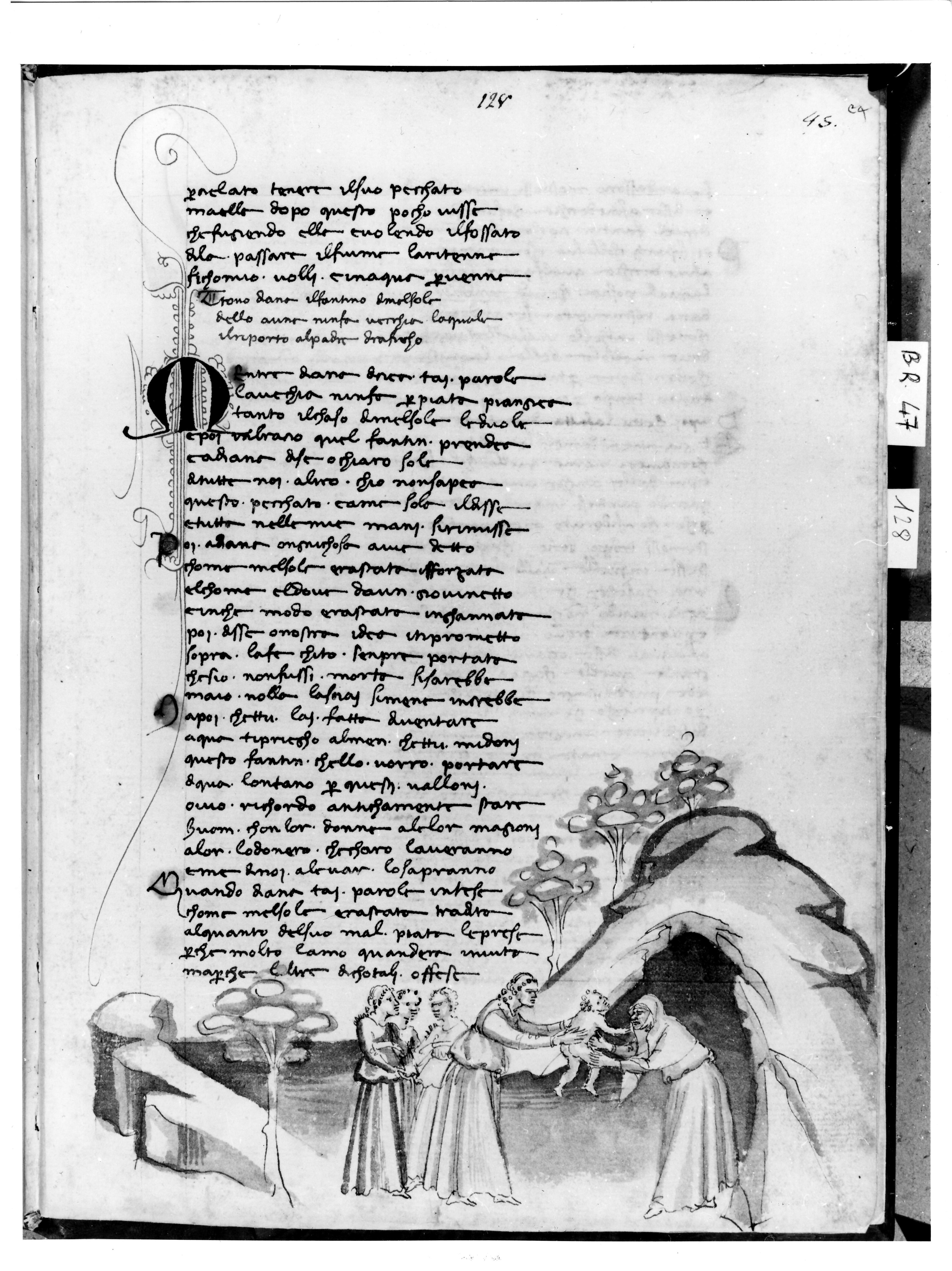 Firenze, Biblioteca Nazionale Centrale, B. R. 47, f. 128r. Le ninfe consegnano Pruneo a Sinedecchia.