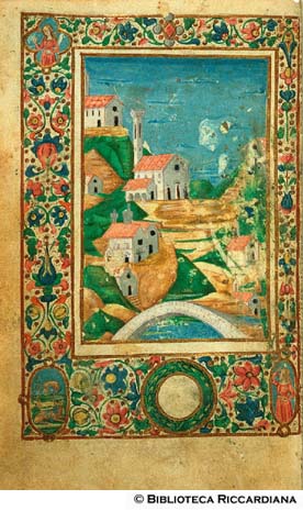 Firenze, Biblioteca Riccardiana, Ricc. 1503, f. 1v. Il copista del manoscritto, datato 1482, è Nicola Mangona. Veduta della valle del Mugnone e della città di Fiesole, con le chiese di San Domenico e San Romolo; nella cornice decorativa sono presenti tre medaglioni in cui sono raffigurati rispettivamente due figure femminili e un gruppo di piccoli animali.