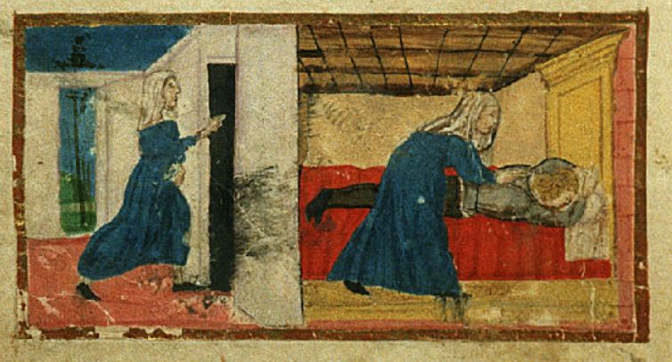 Firenze, Biblioteca Riccardiana, Ricc. 1503, f. 35v. Il copista del manoscritto, datato 1482, è Nicola Mangona. Alimena si reca dal figlio Africo per consolarlo.