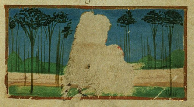 Firenze, Biblioteca Riccardiana, Ricc. 1503, f. 82r. Il copista del manoscritto, datato 1482, è Nicola Mangona. Scena erotica (?). La miniatura è parzialmente abrasa.