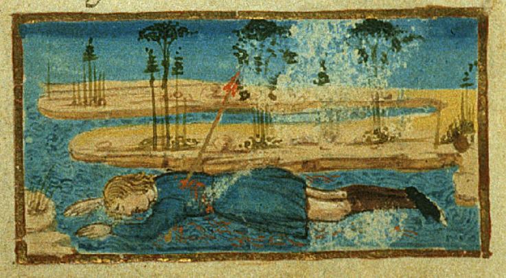 Firenze, Biblioteca Riccardiana, Ricc. 1503, f. 92v. Il copista del manoscritto, datato 1482, è Nicola Mangona. Africo si toglie la vita trafiggendosi con una lancia.