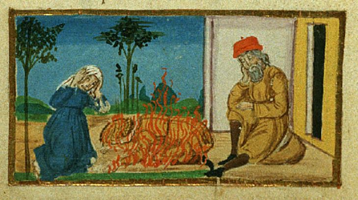 Firenze, Biblioteca Riccardiana, Ricc. 1503, f. 94v. Il copista del manoscritto, datato 1482, è Nicola Mangona. Girafone e Alimena siedono accanto alla pira funebre del figlio Africo.