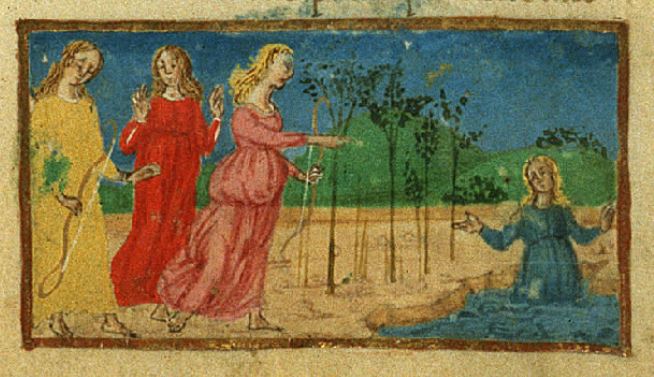 Firenze, Biblioteca Riccardiana, Ricc. 1503, f. 105r. Il copista del manoscritto, datato 1482, è Nicola Mangona. Diana, con due ninfe al seguito, trasforma Mensola in un ruscello.