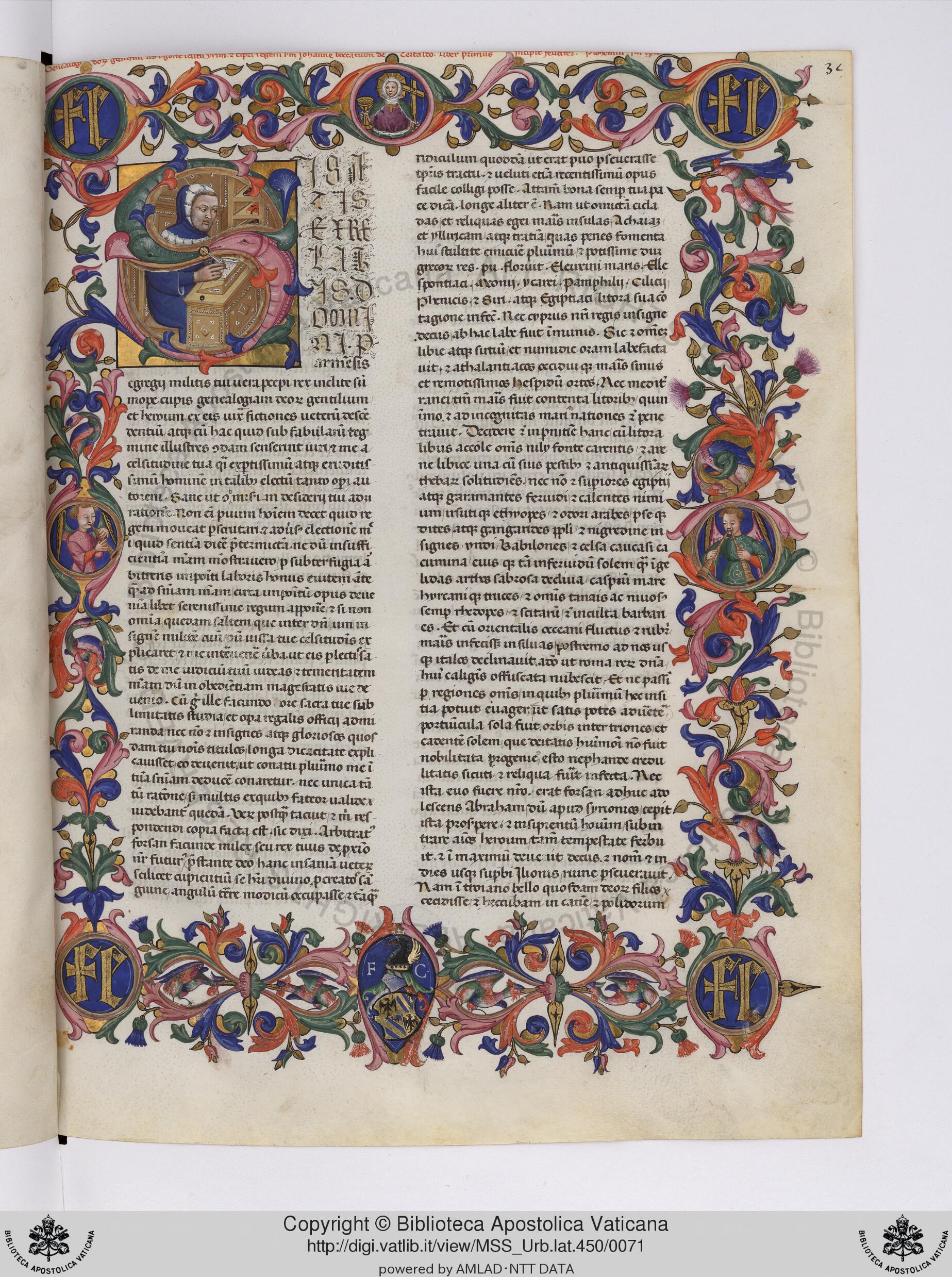 Città del Vaticano, BAV, Urb. lat. 450, f. 31r. Ritratto dell'autore Giovanni Boccaccio seduto allo scrittoio intento a compilare un manoscritto, all'interno dell'iniziale figurata S(i satis); nella cornice marginale decorata sono inseriti tre medaglioni raffiguranti al loro interno due angeli musicanti e una donna che sorregge un calice e una croce (personificazione della Chiesa?).