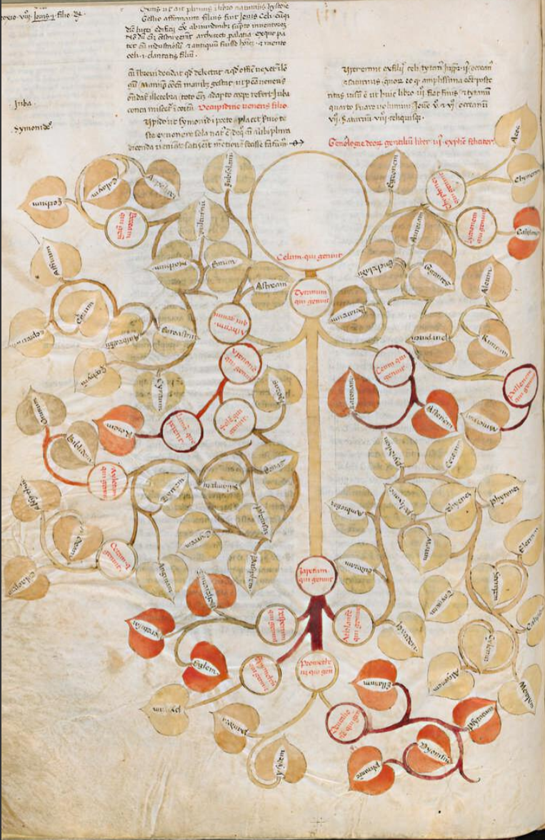 Firenze, Biblioteca Medicea Laurenziana, Plut. 52.9, f. 38v. Manoscritto autografo di Giovanni Boccaccio. Albero genealogico di Celo e Titano.