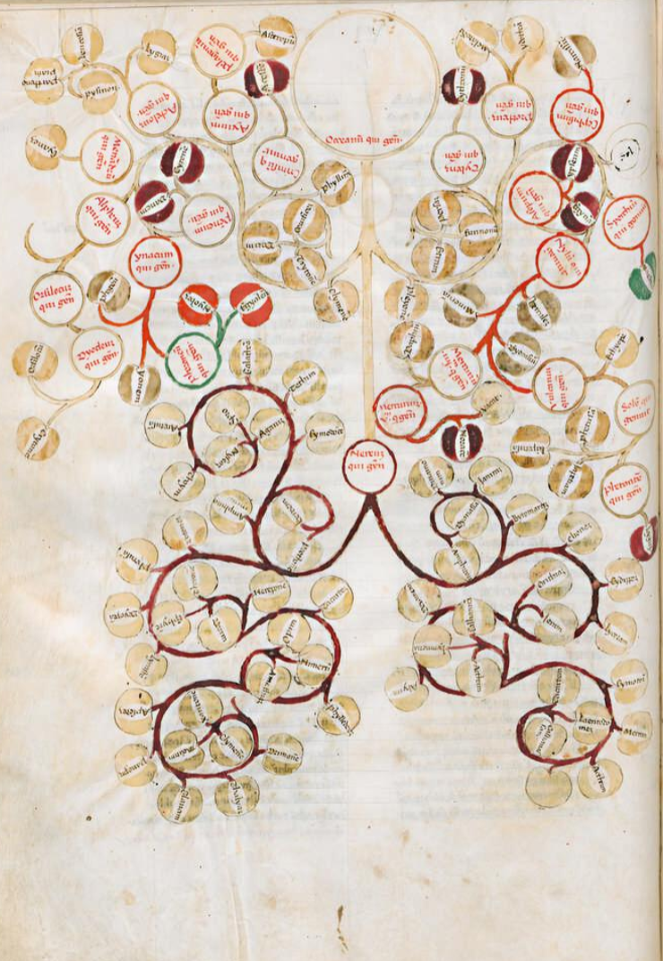 Firenze, Biblioteca Medicea Laurenziana, Plut. 52.9, f. 74v. Manoscritto autografo di Giovanni Boccaccio. Albero genealogico di Oceano.