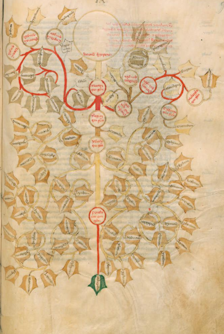 Firenze, Biblioteca Medicea Laurenziana, Plut. 52.9, f. 90r. Manoscritto autografo di Giovanni Boccaccio. Albero genealogico di Giunone.