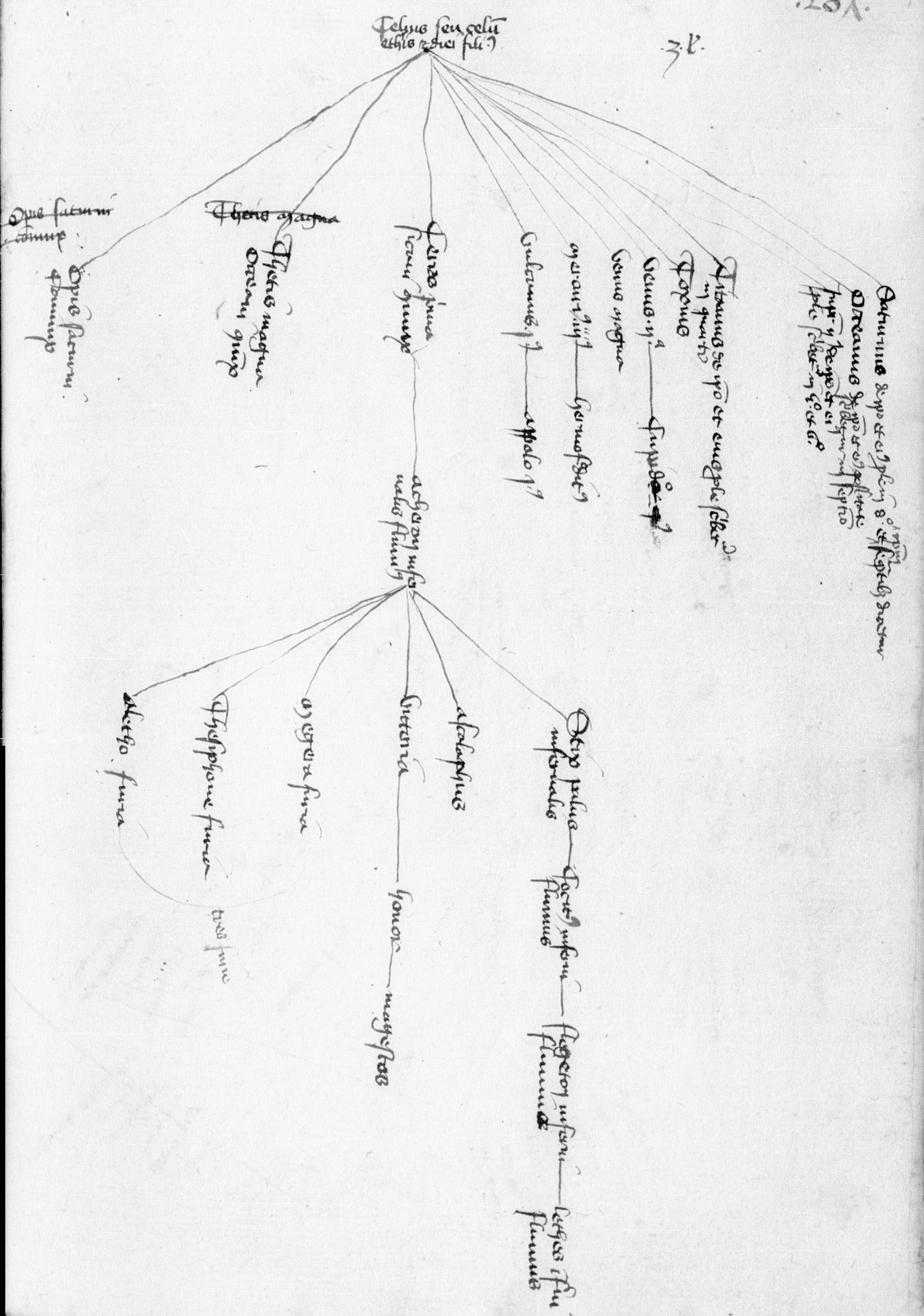 Parigi, Bibliothèque Nationale de France, Lat. 14716, f. 206v. Il copista del manoscritto è Gérard Martel. Albero genealogico di Etere.