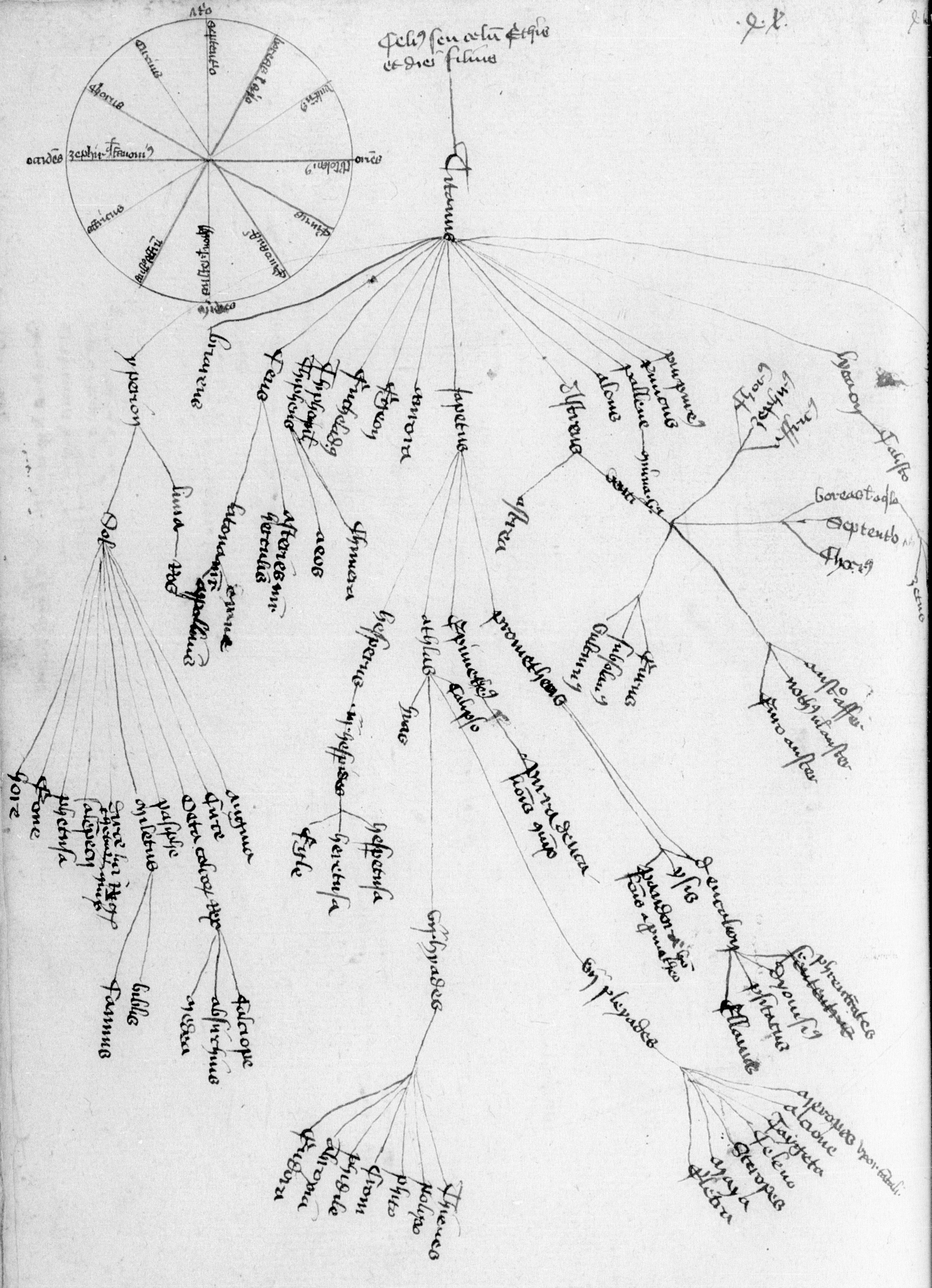Parigi, Bibliothèque Nationale de France, Lat. 14716, f. 208r. Il copista del manoscritto è Gérard Martel. Albero genealogico di Giove secondo.