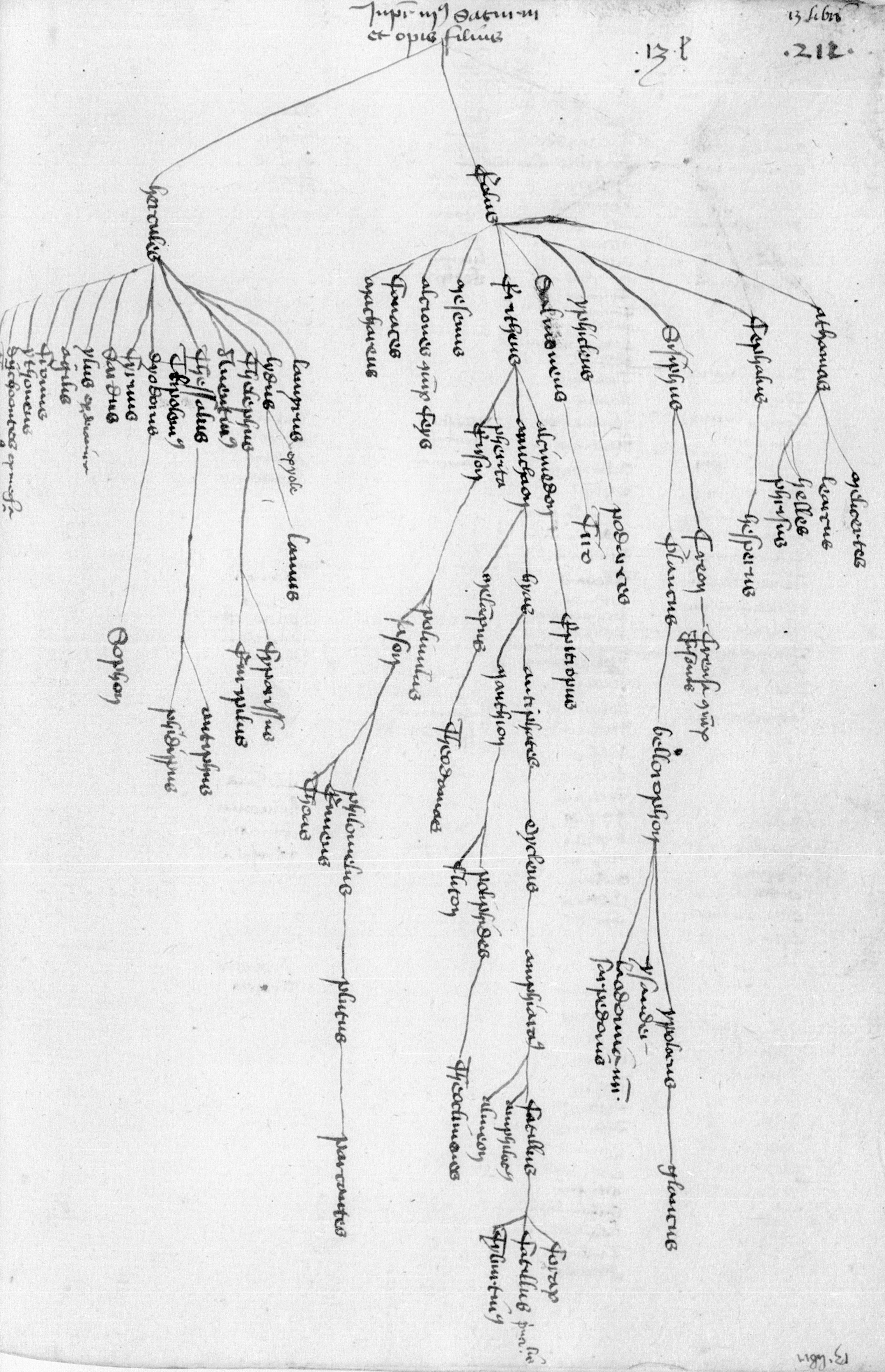 Parigi, Bibliothèque Nationale de France, Lat. 14716, f. 211v. Il copista del manoscritto è Gérard Martel. Albero genealogico di Giove terzo.