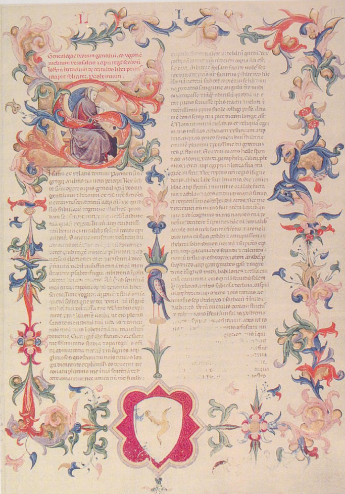 Chicago, University of Chicago Library, 100, f. 11r. L'autore Giovanni Boccaccio siede allo scrittoio con un libro aperto dinanzi, all'interno dell'iniziale figurata S(i satis); in basso, stemma di Coluccio Salutati.