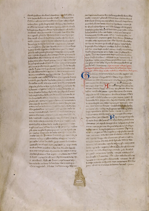 Membr., cc. I + 112 + I’, mm. 371 x 266. Caduti tre fascicoli; carta incipitaria integrata all’inizio del sec. XV. "Decameron". Databile attorno al 1370. Di mano del B. anche: frequenti correzioni o varianti alternative in margine o in interlinea, alcune in scrittura dal ductus posato (ad es. alla c. 2r), altre in scrittura sottile a penna rovesciata (ad es. alla c. 27r); piccoli motivi decorativi di forma floreale aggiunti al termine di alcune novelle (ad es. alla c. 12v), due maniculae (alle cc. 65v e 88r), tredici figurine a mezzo busto raffiguranti novellatori e protagonisti delle novelle che racchiudono i richiami di fine fascicolo (cc. 8v, 16v, 23v, 31v, 39v, 47v, 55v, 63v, 71v, 79v, 87v, 95v, 103v). Porzioni di testo ripassate nei secoli successivi hanno generato talvolta lezioni erronee (che alimentarono per lungo tempo dubbi sull’autografia). Numerose postille, risalenti ai secoli XIV-XVI, attribuibili a dodici mani diverse, tra cui quelle di Pietro Bembo (alla c. 33r) e forse Angelo Colocci (alla c. 78v).