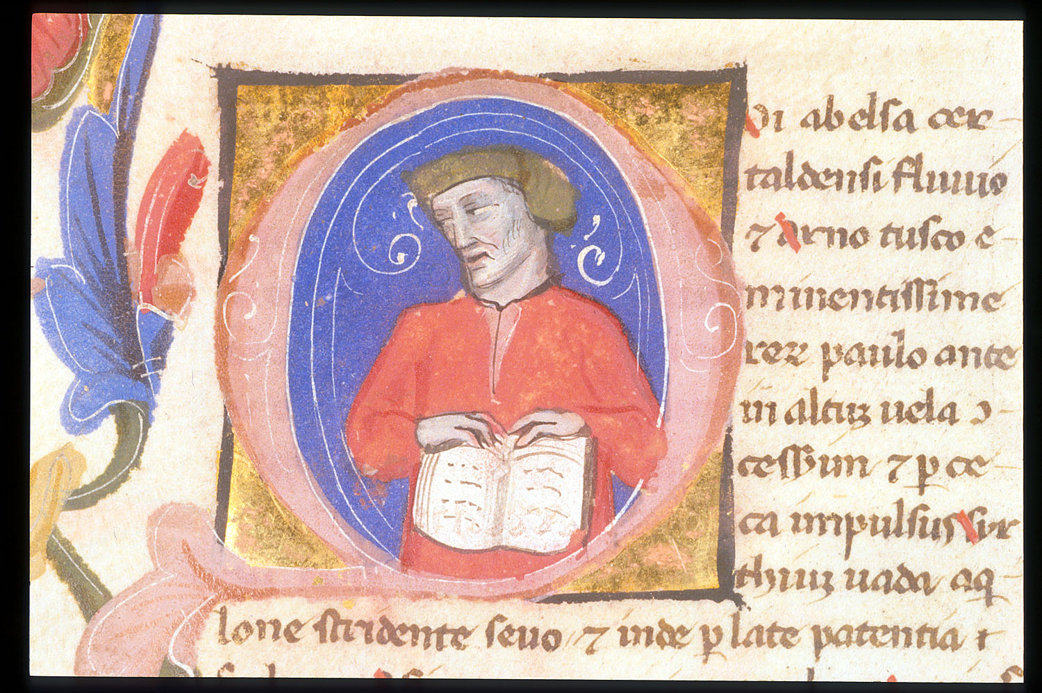 Londra, British Library, Egerton 1865, f. 81v. Il manoscritto è datato 23 giugno 1388. Un uomo a mezzobusto vestito di rosso con un libro aperto, all'interno dell'iniziale figurata Q(ui ab Elsa).