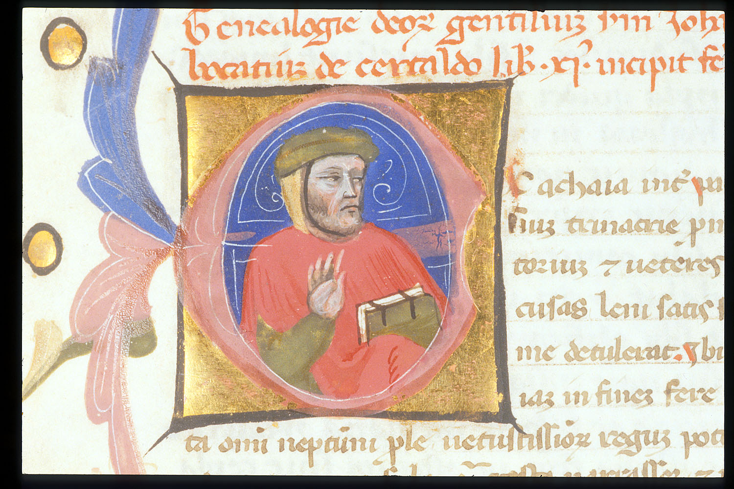 Londra, British Library, Egerton 1865, f. 119r. Il manoscritto è datato 23 giugno 1388. Un uomo a mezzobusto vestito di rosso con un libro, all'interno dell'iniziale figurata E(x Achaya).