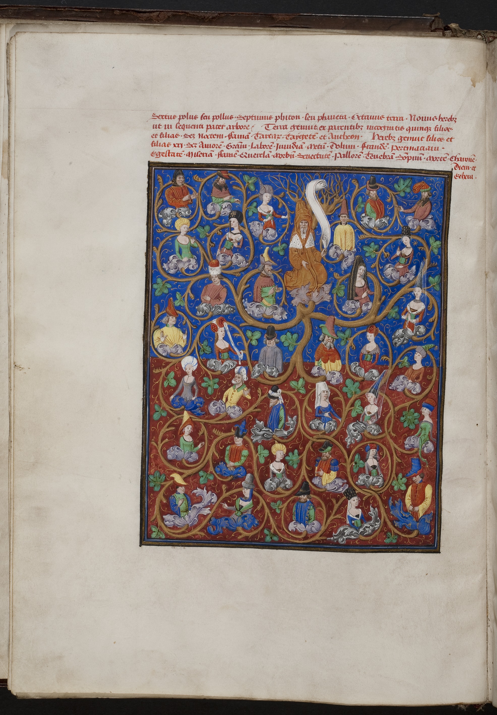 Bruges, Bibliotheek van het Grootseminarie, 154/44, f. 13v. Albero genealogico di Demogorgone: all'interno di ogni voluta è rappresentato un personaggio maschile o femminile a mezzobusto.
