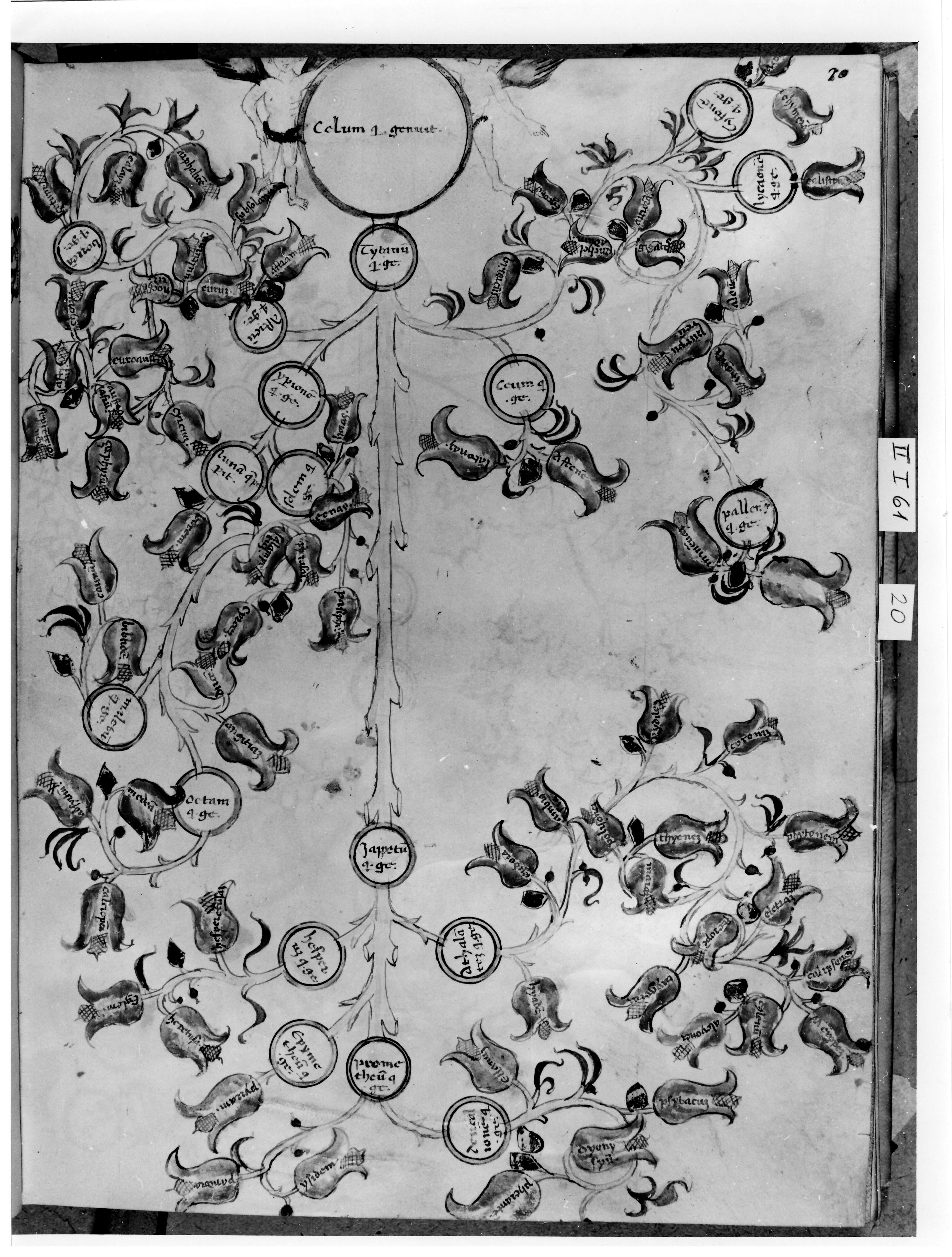 Firenze, Biblioteca Nazionale Centrale, II.I.61, f. 20r. Albero genealogico di Celo e Titano.