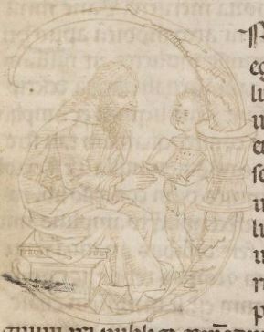 Cambridge (Mass.), Harvard University, Houghton Library, Richardson 41, f. 1r. Un vecchio barbuto siede leggendo un libro retto da un giovane putto, all'interno dell'iniziale istoriata P(ridie).