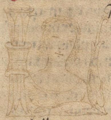 Cambridge (Mass.), Harvard University, Houghton Library, Richardson 41, f. 10v. Busto di fanciulla, all'interno dell'iniziale figurata L(avinia).