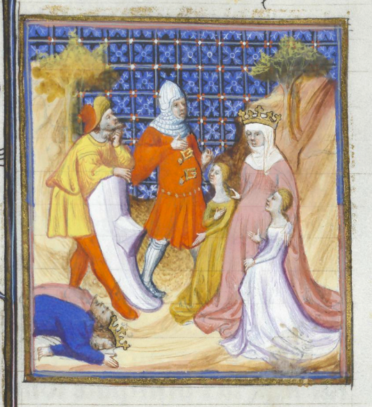 Bruxelles, Koninklijke Bibliotheek van België, 9509, f. 94r. La regina Olimpiade, accompagnata da due donne del suo seguito, affronta i sicari mandati da Cassandro a giustiziarla per l'assassinio del re Filippo Arrideo.