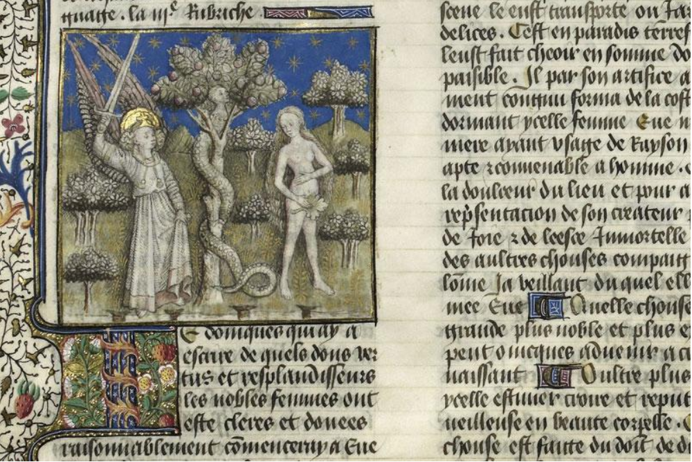 Chantilly, Bibliothèque du Château de Chantilly, 856, f. 34v. Eva, dopo aver mangiato il frutto proibito tentata dal serpente, viene cacciata dal Paradiso Terrestre dall'angelo armato di spada.