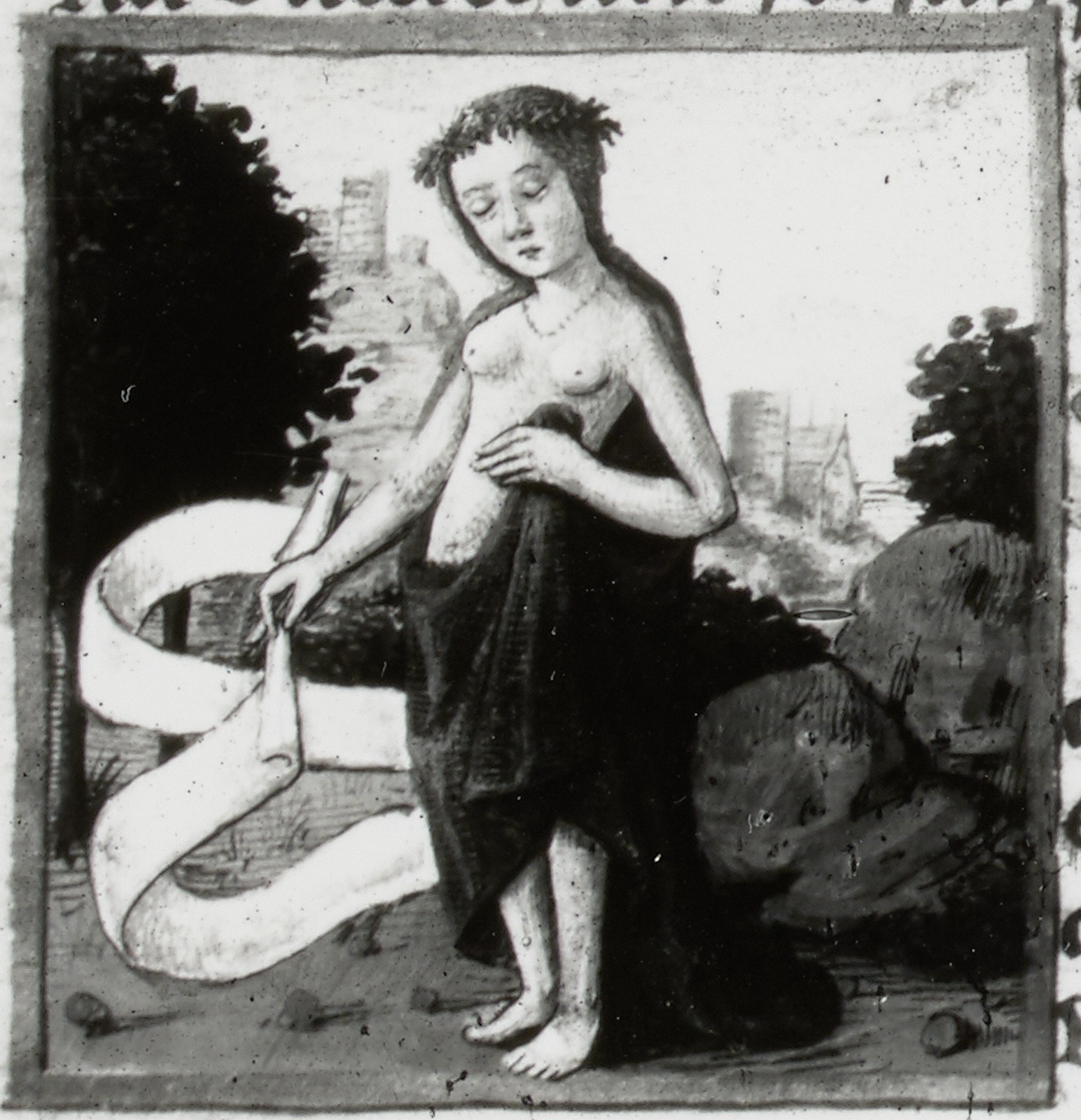 Dresda, Sächsische Landesbibliothek, F 171 b, f. 9r. La vergine Opi, coronata di fiori, regge un filatterio.