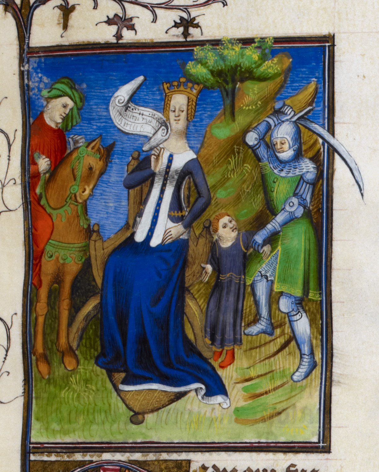 Londra, British Library, Royal 20 C V, f. 29r. Medea, seduta sul trono con una pergamena tra le mani, ordina ad un soldato di uccidere il figlio avuto con Giasone, il quale sopraggiunge a cavallo sulla sinistra.
